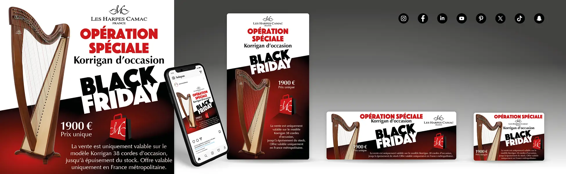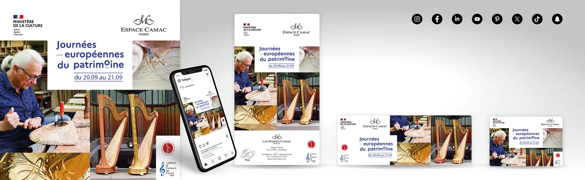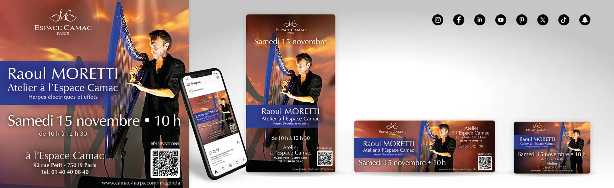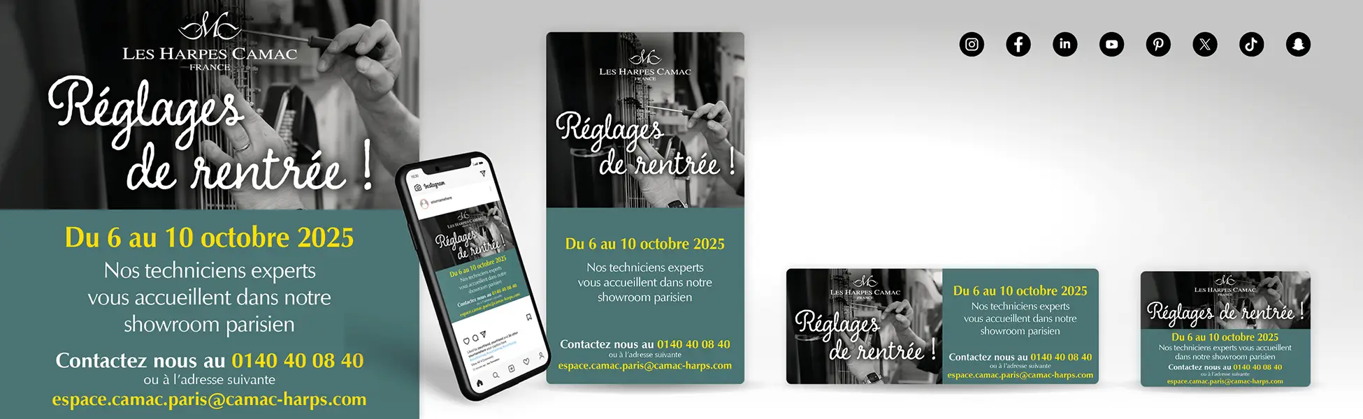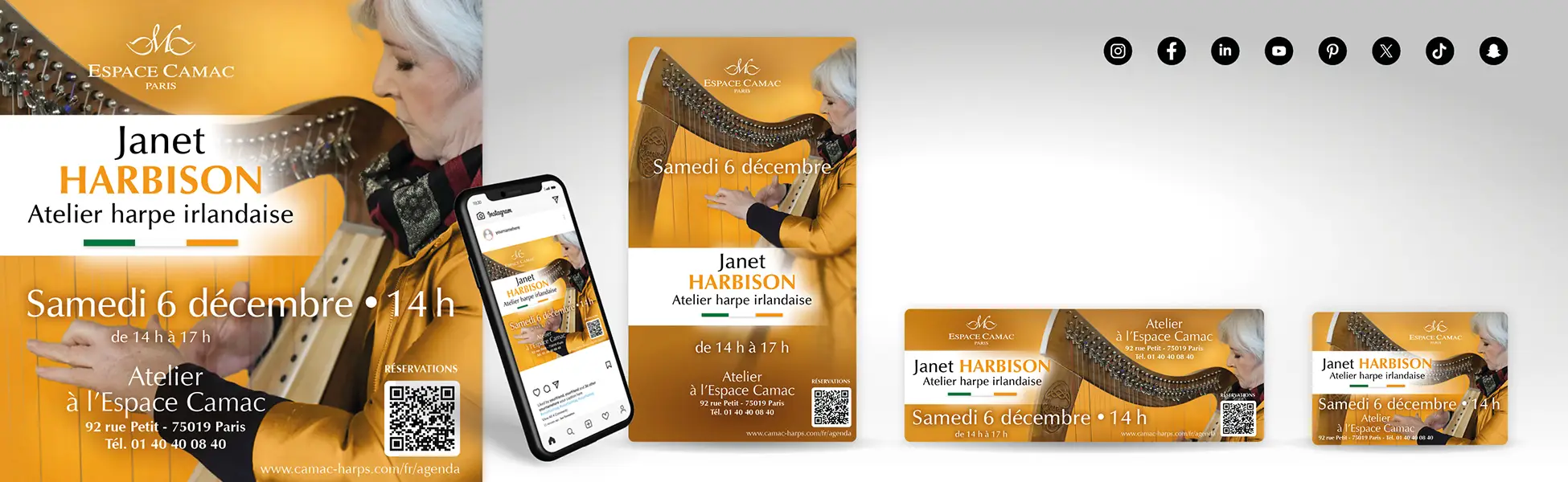 Tout au long de l’année, Camac-Harps assure une communication régulière pour promouvoir ses actions commerciales et événementielles. En complément des supports traditionnels (annonces presse, dépliants, affiches), HC utilise activement les réseaux sociaux avec des visuels adaptés aux formats Instagram, Facebook, X, ainsi que des bannières digitales pour ses sites partenaires.