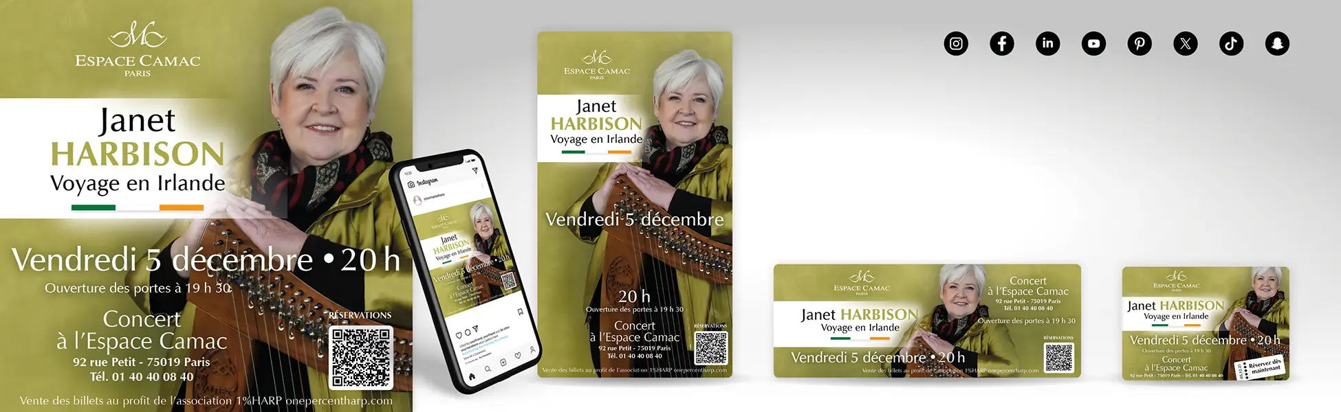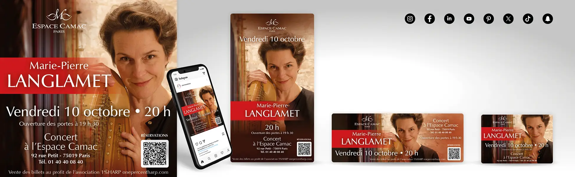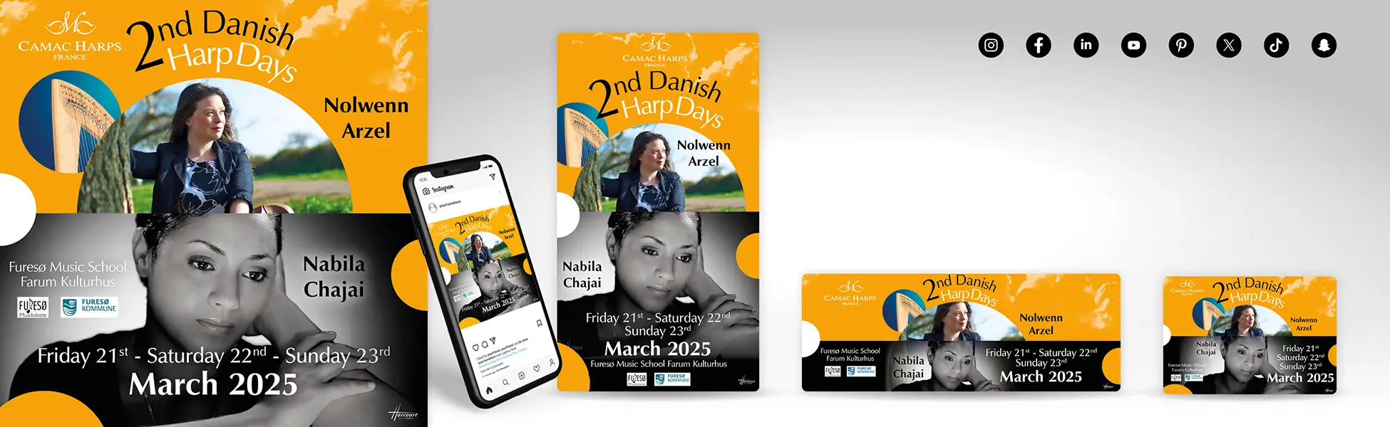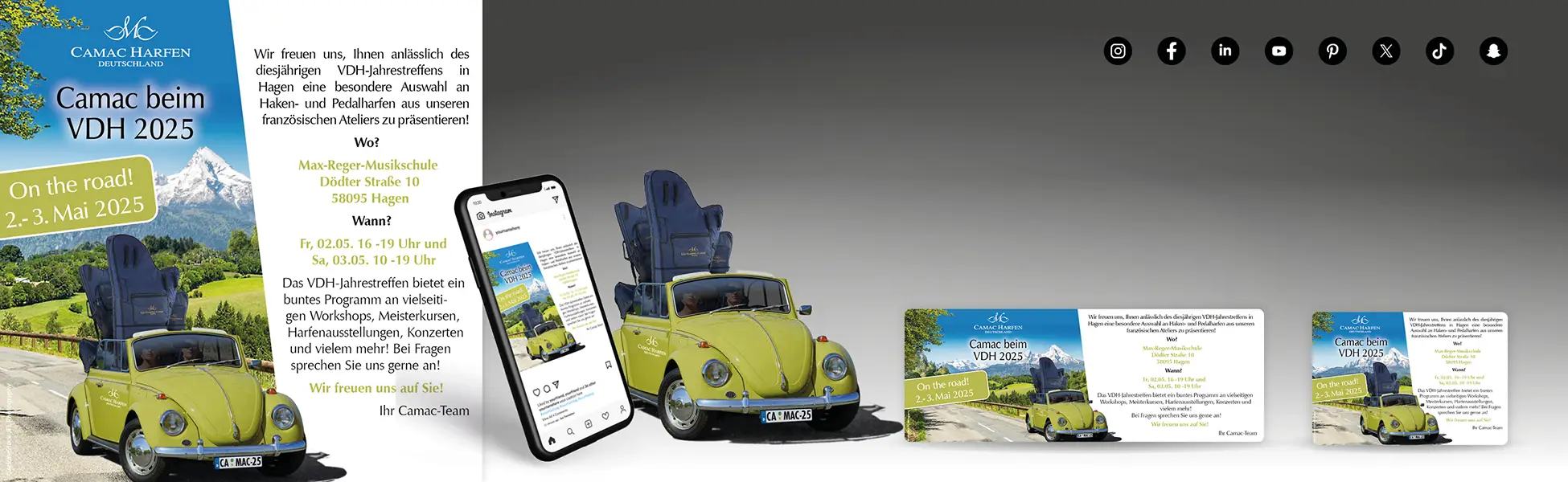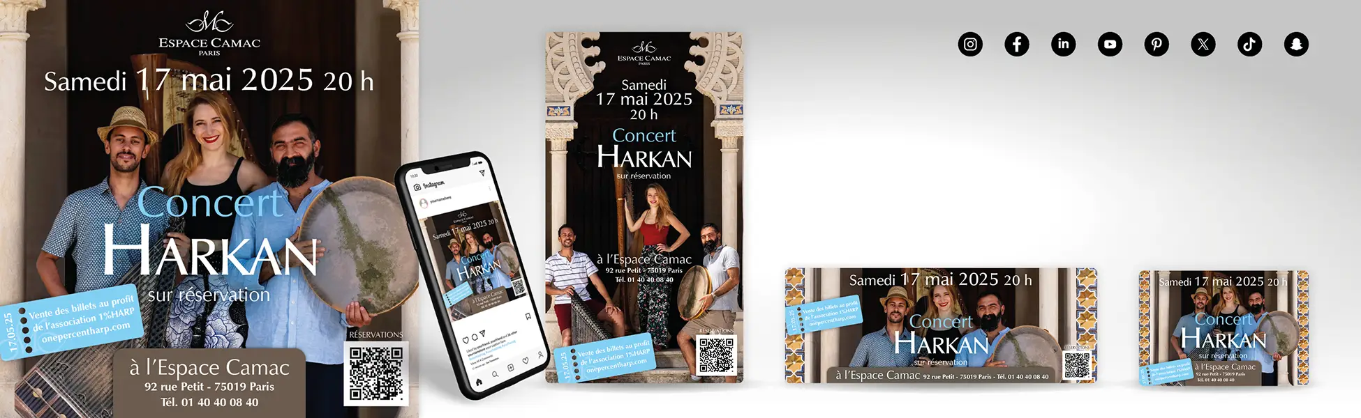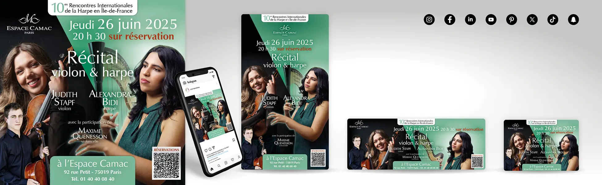 Tout au long de l’année, Camac-Harps assure une communication régulière pour promouvoir ses actions commerciales et événementielles. En complément des supports traditionnels (annonces presse, dépliants, affiches), HC utilise activement les réseaux sociaux avec des visuels adaptés aux formats Instagram, Facebook, X, ainsi que des bannières digitales pour ses sites partenaires.