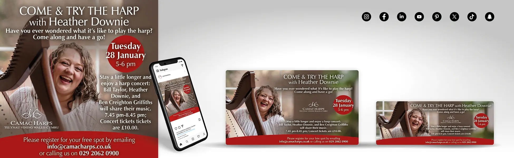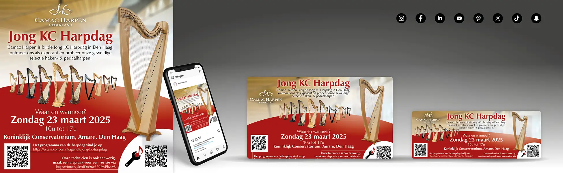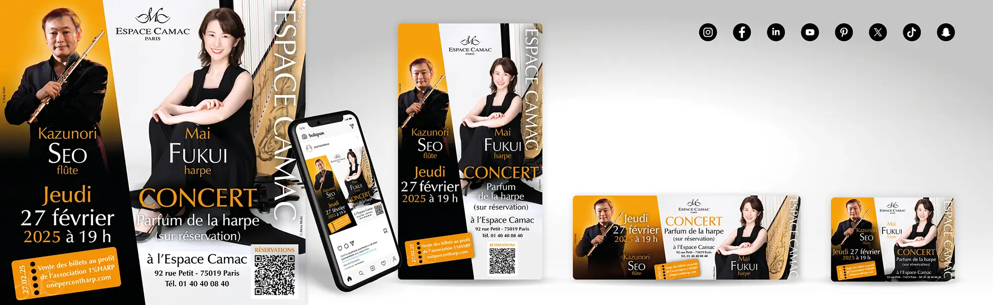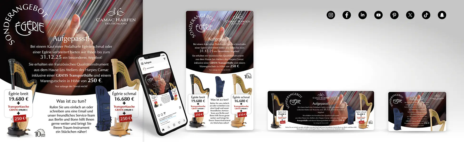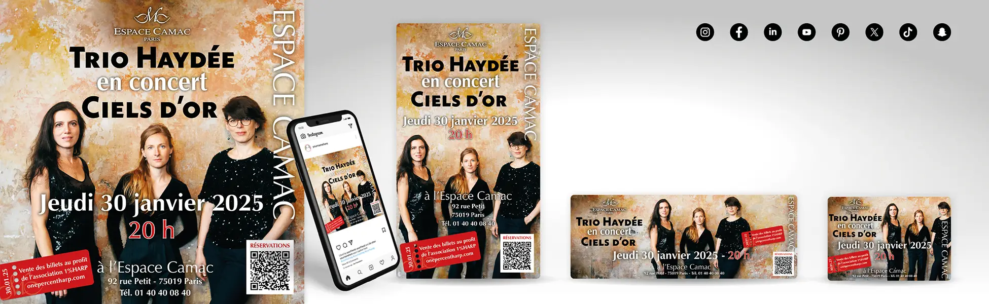 Tout au long de l’année, Camac-Harps assure une communication régulière pour promouvoir ses actions commerciales et événementielles. En complément des supports traditionnels (annonces presse, dépliants, affiches), HC utilise activement les réseaux sociaux avec des visuels adaptés aux formats Instagram, Facebook, X, ainsi que des bannières digitales pour ses sites partenaires.