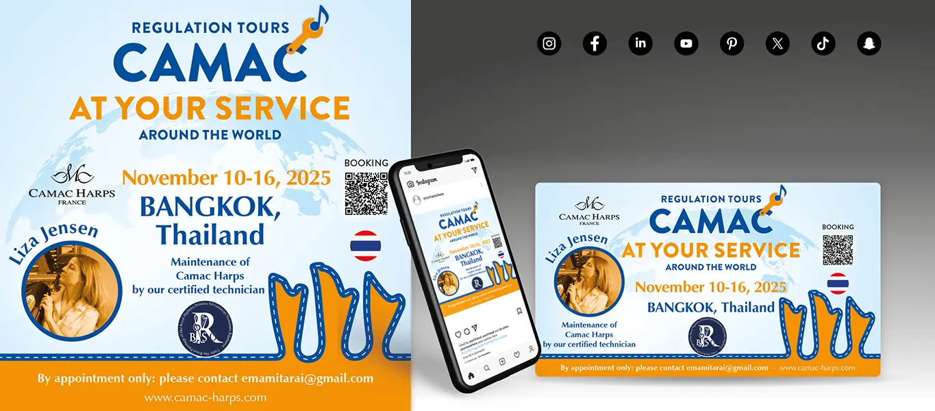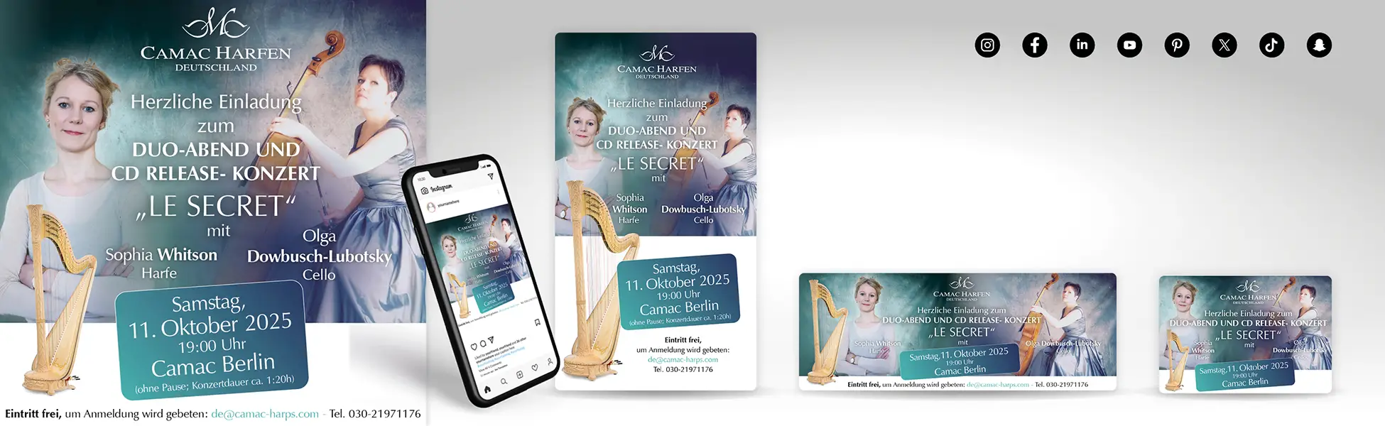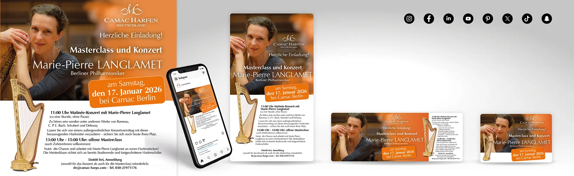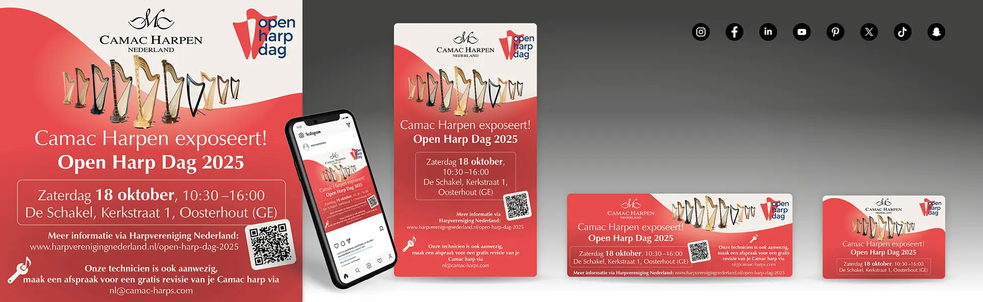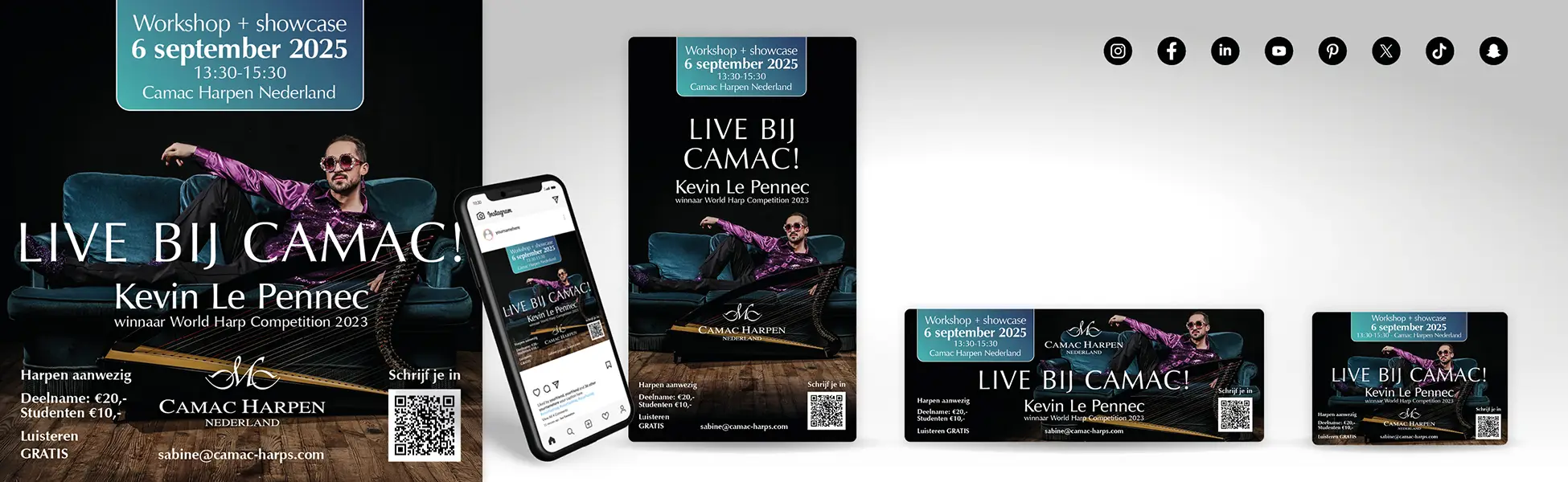 Tout au long de l’année, Camac-Harps assure une communication régulière pour promouvoir ses actions commerciales et événementielles. En complément des supports traditionnels (annonces presse, dépliants, affiches), HC utilise activement les réseaux sociaux avec des visuels adaptés aux formats Instagram, Facebook, X, ainsi que des bannières digitales pour ses sites partenaires.