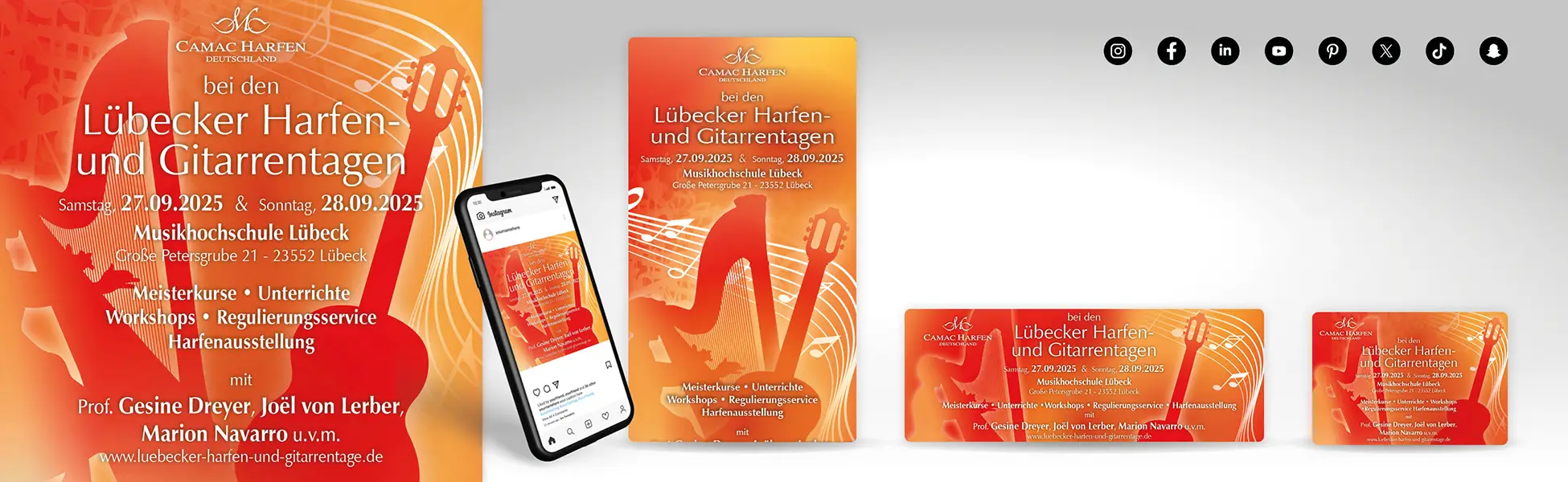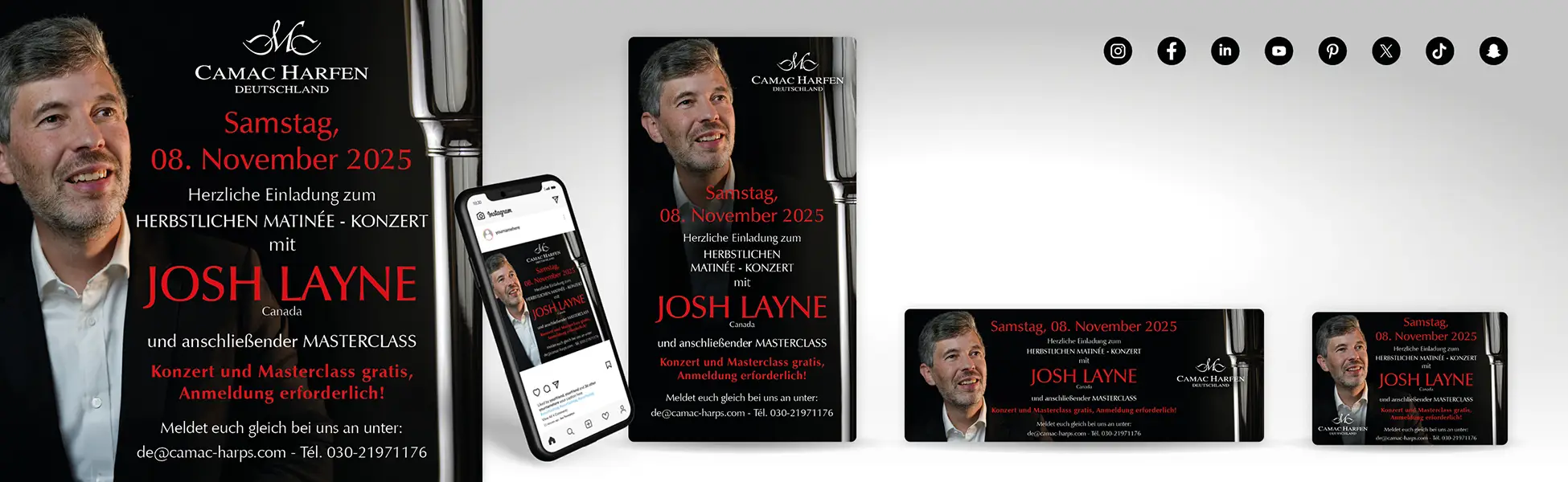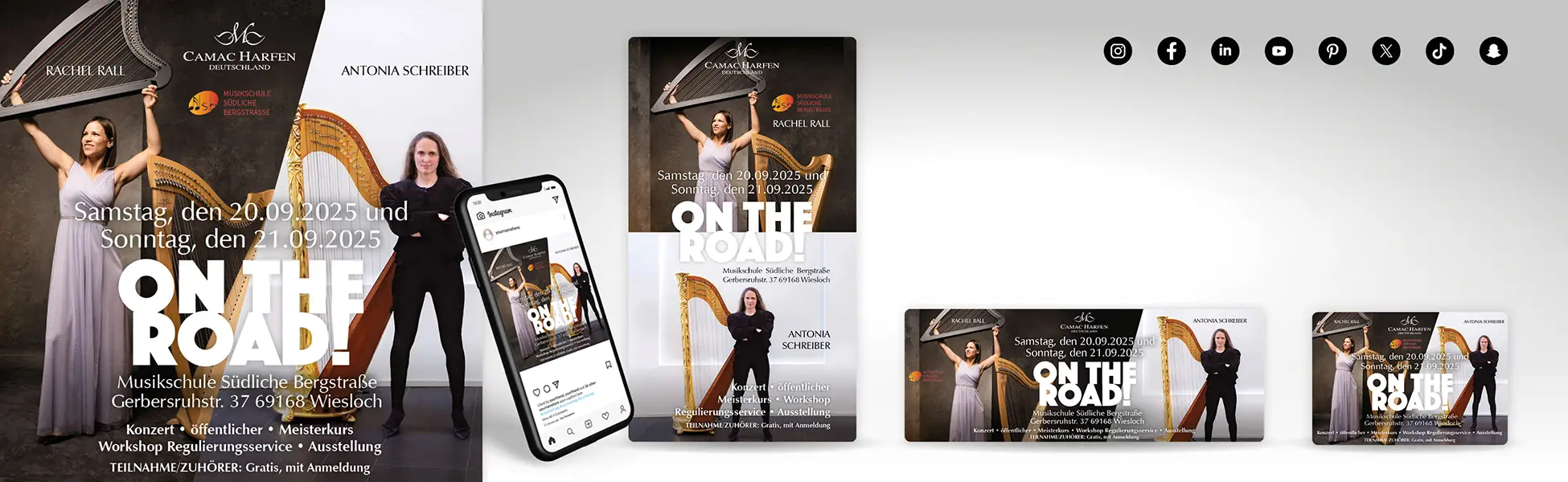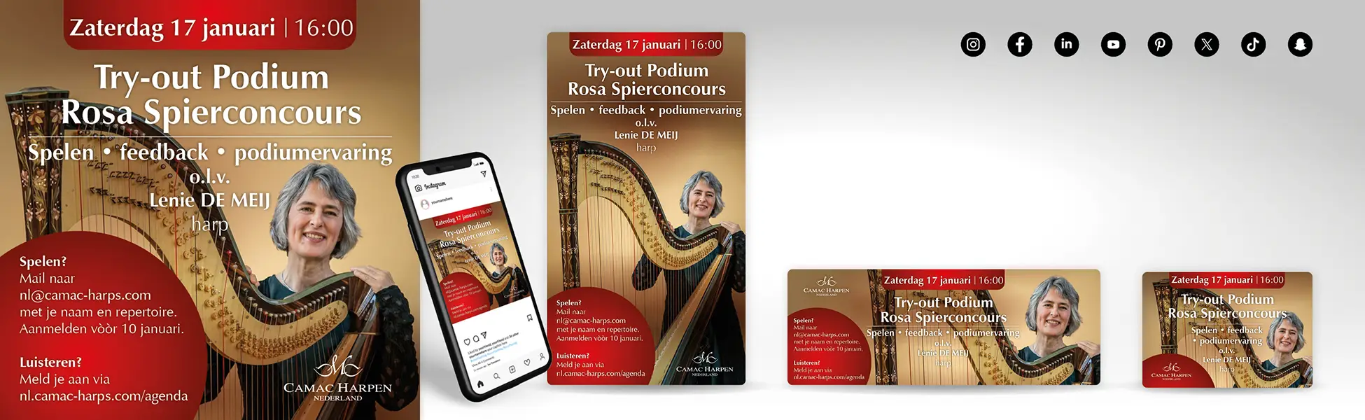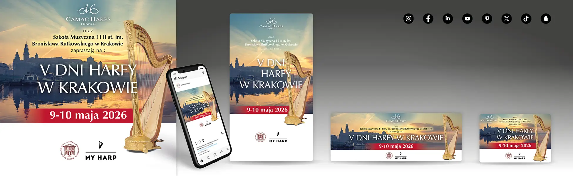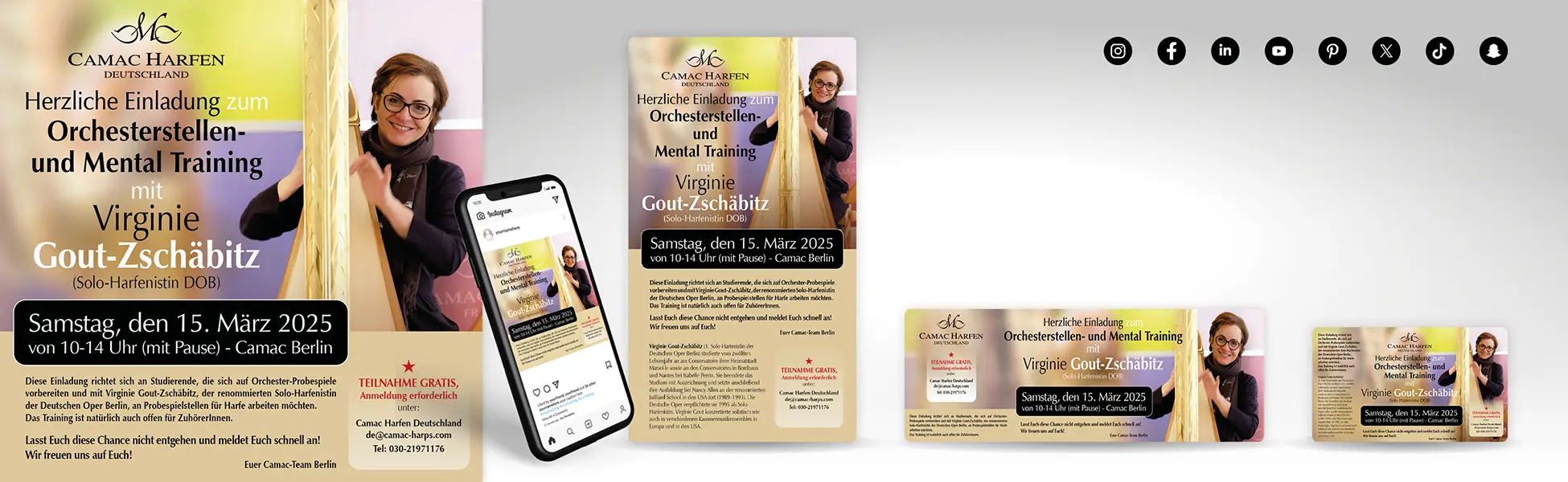 Tout au long de l’année, Camac-Harps assure une communication régulière pour promouvoir ses actions commerciales et événementielles. En complément des supports traditionnels (annonces presse, dépliants, affiches), HC utilise activement les réseaux sociaux avec des visuels adaptés aux formats Instagram, Facebook, X, ainsi que des bannières digitales pour ses sites partenaires.