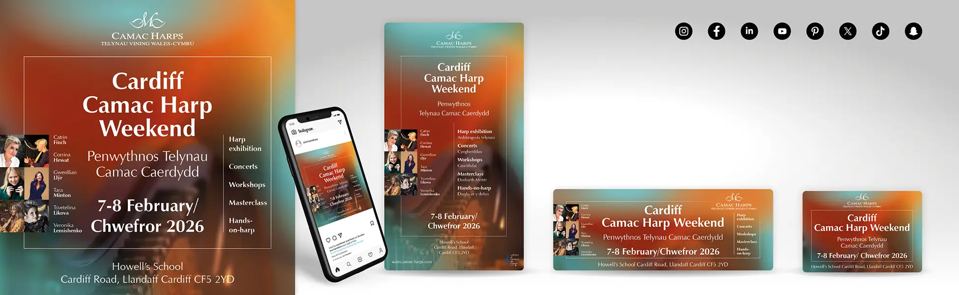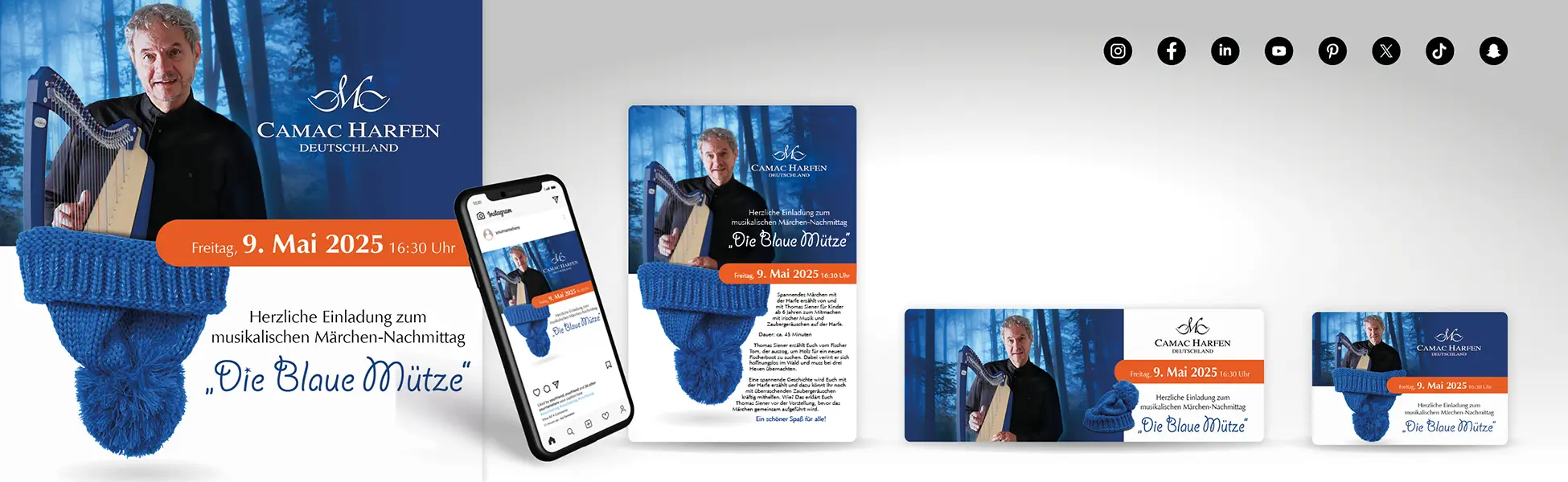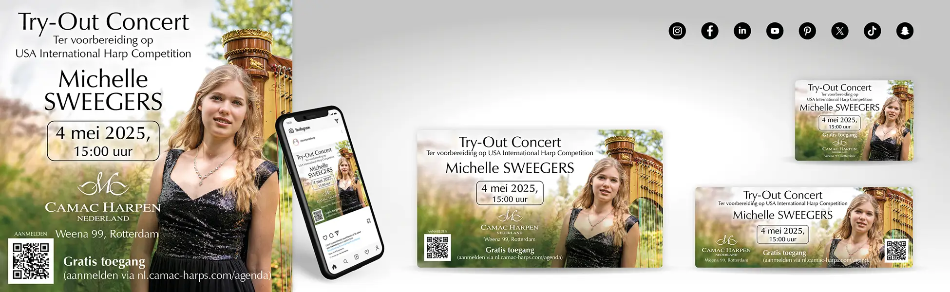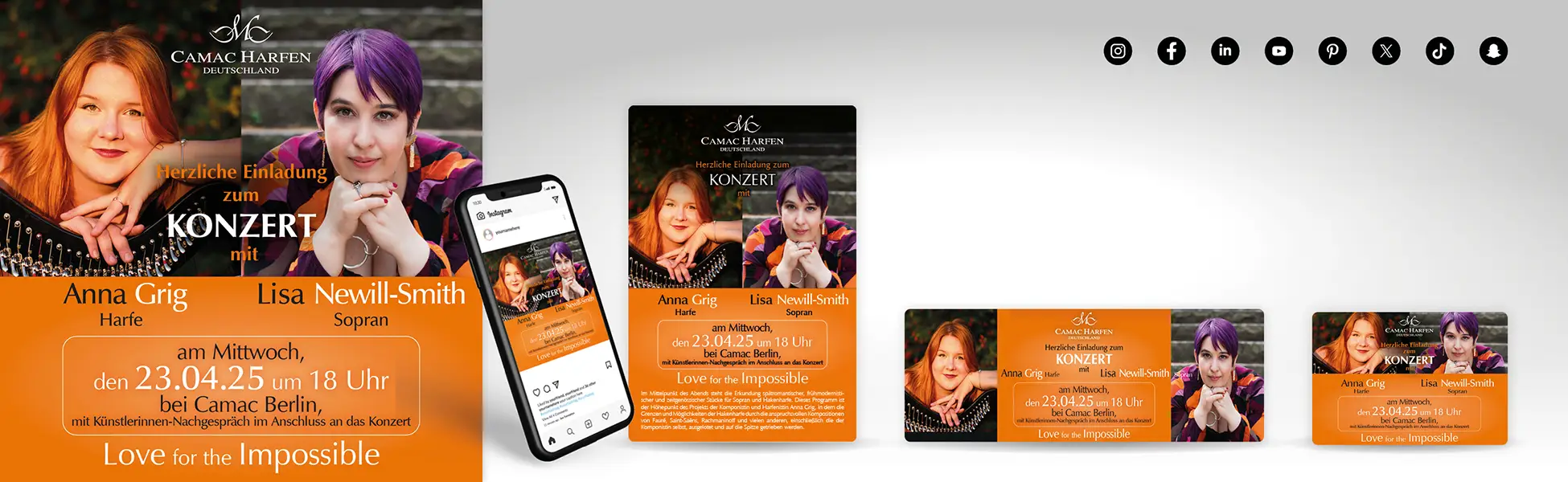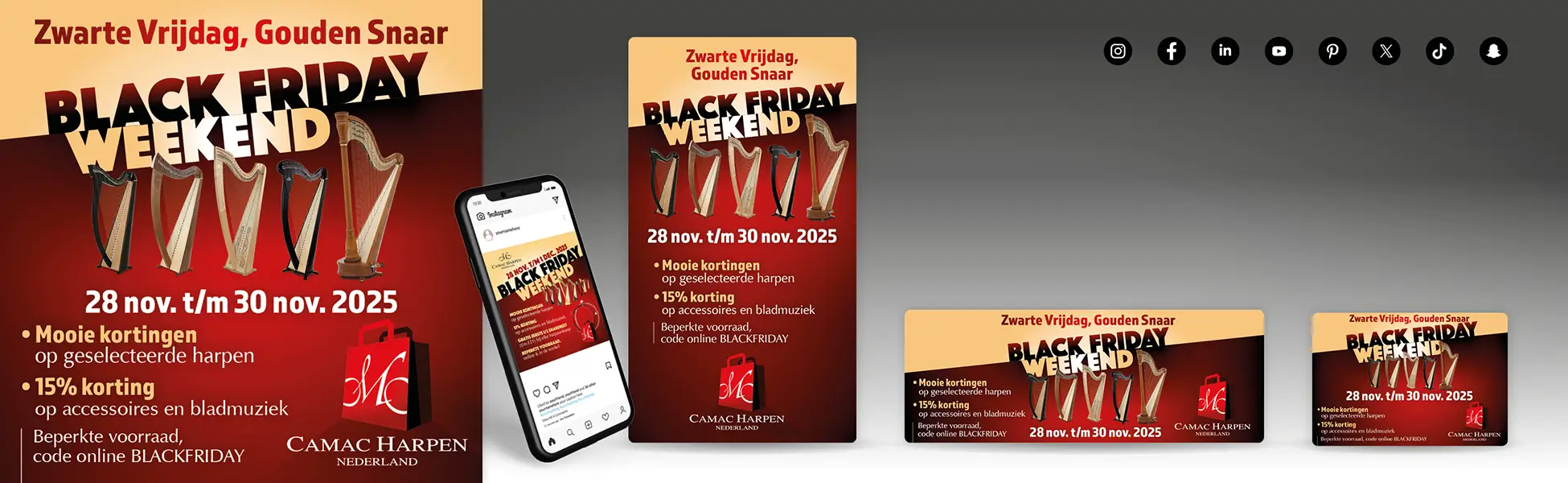 Tout au long de l’année, Camac-Harps assure une communication régulière pour promouvoir ses actions commerciales et événementielles. En complément des supports traditionnels (annonces presse, dépliants, affiches), HC utilise activement les réseaux sociaux avec des visuels adaptés aux formats Instagram, Facebook, X, ainsi que des bannières digitales pour ses sites partenaires.